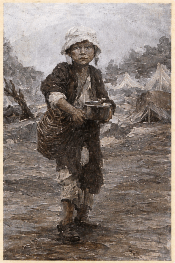 “Η προσφυγοπούλα του στρατοπέδου” στη Φιλιππιάδα, σε σκίτσο της Θ. Φλωρά – Καραβία. (Πηγή : ΕΝΤΥΠΩΣΕΙΣ ΑΠΟ ΤΟΝ ΠΟΛΕΜΟ ΤΟΥ 1912 – 1913, Θάλεια Φλωρά – Καραβία, Αθήναι, 1936)