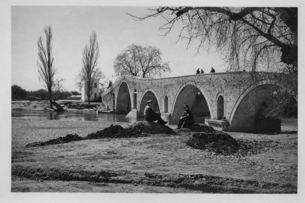 Μια παλιά φωτογραφία από την δεκαετία του 1920. Δυο στρατιωτικοί ξεκουράζονται δίπλα στον Άραχθο, άλλοι στέκονται πάνω στο γεφύρι, σαν να παρατηρούν τον χρόνο να περνά. Το τοπίο αλλάζει, το γεφύρι μένει — μάρτυρας ζωών, στιγμών και εποχών που χάθηκαν αλλά δεν ξεχάστηκαν…(Φωτο από αρχείο Κ.Β.)