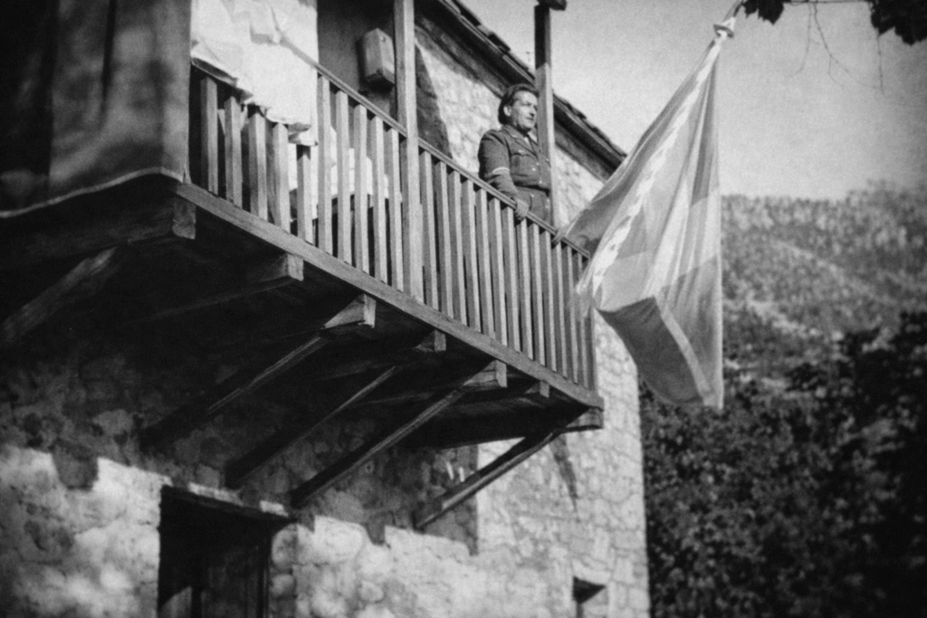 Η οικία του ιατρού Αναγνώστου στο Βουργαρέλι όπου στεγαζόταν το αρχηγείο του Στρατηγού Ν. Ζέρβα και όπου η ελληνικη σημαία κυμάτιζε ελεύθερη. Στο μπαλκόνι η Κούλα Λαλάκου, αδελφή του Ν. Ζέρβα. (Πηγή : : 9 ΧΡΟΝΙΑ & 9 ΜΗΝΕΣ, Ι. Π. Γεωργακόπουλος, Αθήνα, 2025)