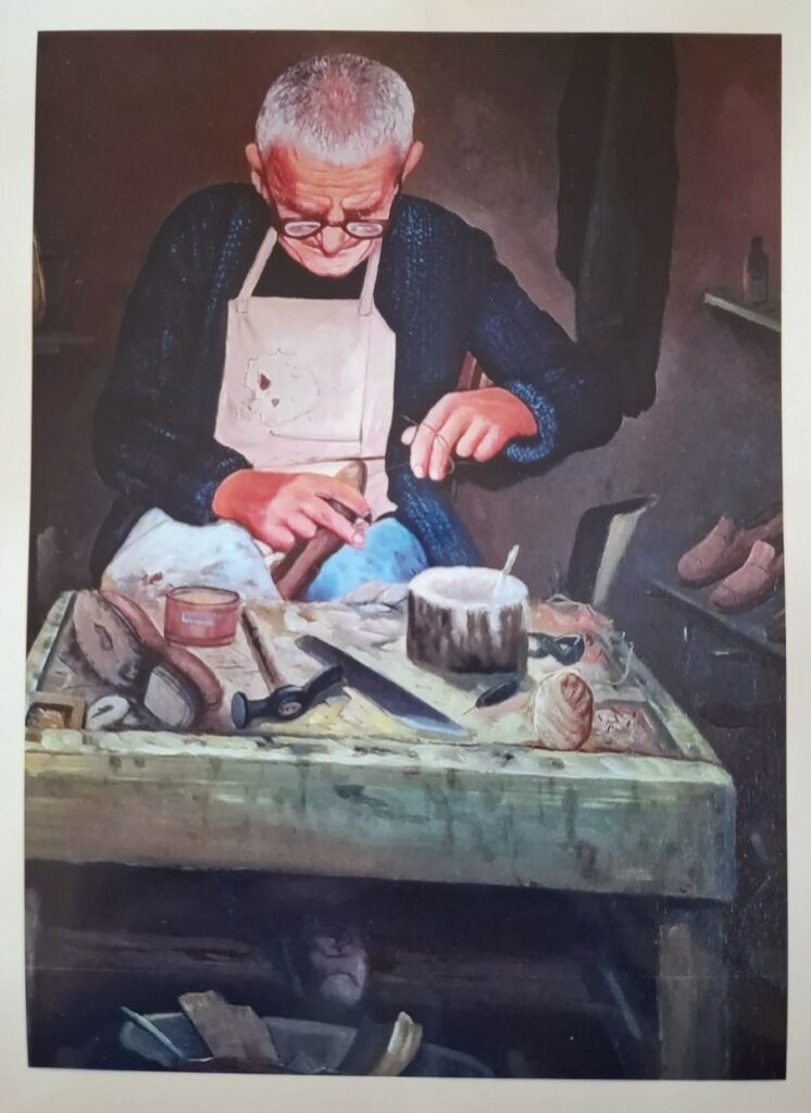 Η ζωγραφική απόδοση δεν αποτυπώνει μόνο μια επαγγελματική στιγμή, αλλά έναν ολόκληρο τρόπο ζωής: την αφοσίωση στη δουλειά, τη λιτότητα και τη σιωπηλή αξιοπρέπεια των ανθρώπων του μόχθου. Είναι μια εικόνα που μυρίζει ακόμα βετζινόκολλα και θυμίζει πόρτες πάντα ανοιχτές, καλημέρες στον δρόμο και μια πόλη πιο ανθρώπινη.