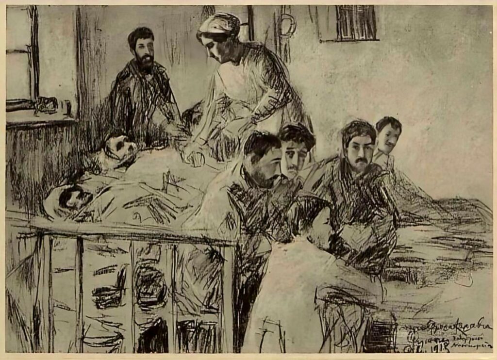 Στη φωτογραφία σκίτσο της ζωγράφου με τίτλο “Η Δνις Ολγα Παπαδάκη εἰς το στρατιωτικόν νοσοκομεῖον της Φιλιππιάδος”, από το ίδιο βιβλίο.