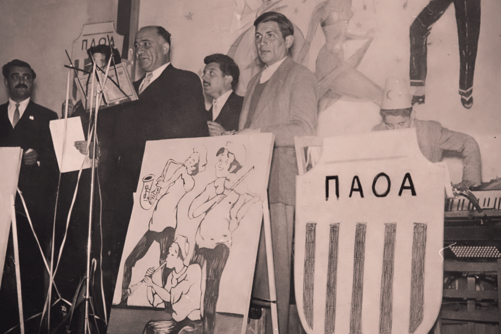 Ο Γενικός Αρχηγός Μήτσος Συγγούνας (πρώην μεγάλος άσσος 1930 – 1940) στο βήμα. Δίπλα του ο Γεώργιος Χουλιάρας (πρώην άσσος 1939 – 1947) και τα μέλη της ορχήστρας Σπύρος Ζαρκαλής (τραγουδοποιός) και Αλέκος Χαρίσης. (Φωτο & Παρουσίαση Κ. Μπανιάς)