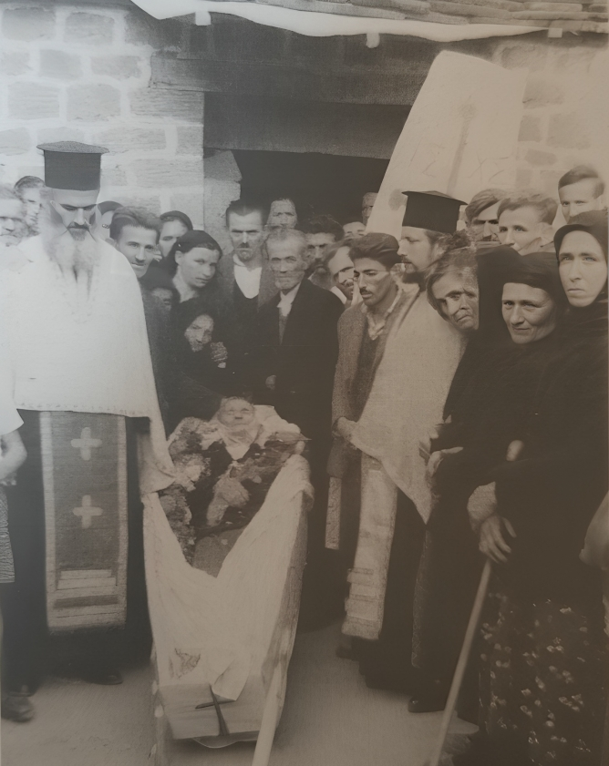 Στη φωτογραφία “Κηδεία στη Ροδαυγή Άρτης, 1962”. Η εικόνα του θανάτου δεν ανήκει μόνο στο μακρινό παρελθόν της φωτογραφίας· υπήρξε, μέχρι πρόσφατα, μέρος μιας συλλογικής εμπειρίας — δημόσιας, σχεδόν κοινόχρηστης. (Πηγή : Λεύκωμα ΡΟΔΑΥΓΗ, ΕΝΑ ΤΑΞΙΔΙ ΣΤΟ ΧΤΕΣ, Χ. Σταύρος, Άρτα, 2020)
