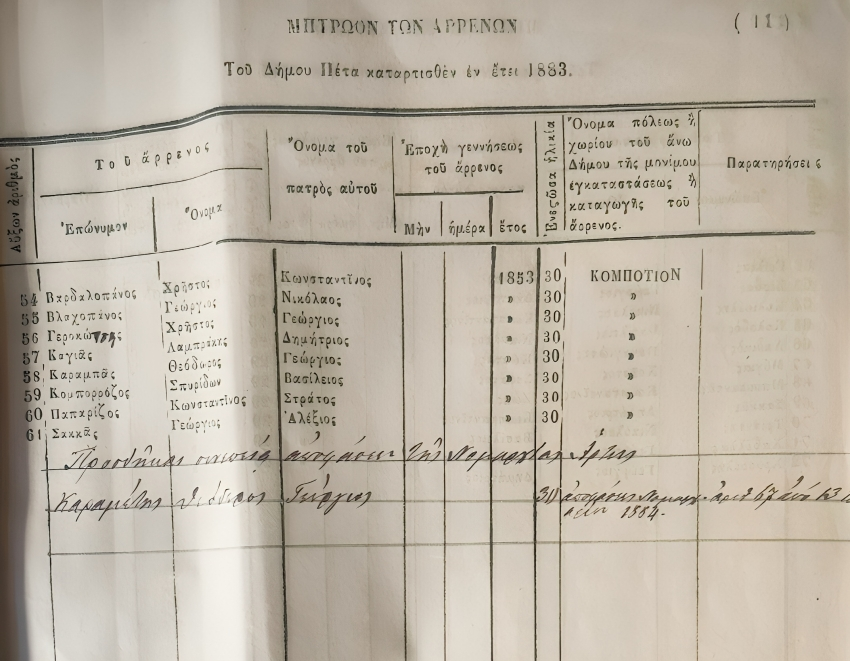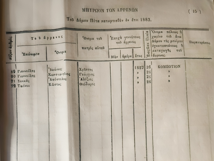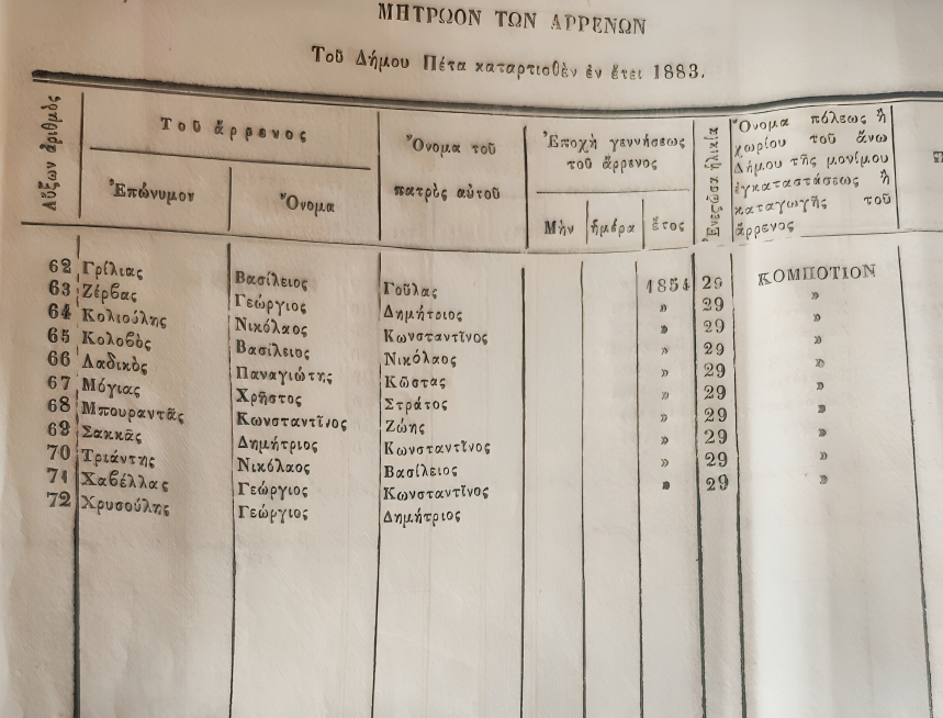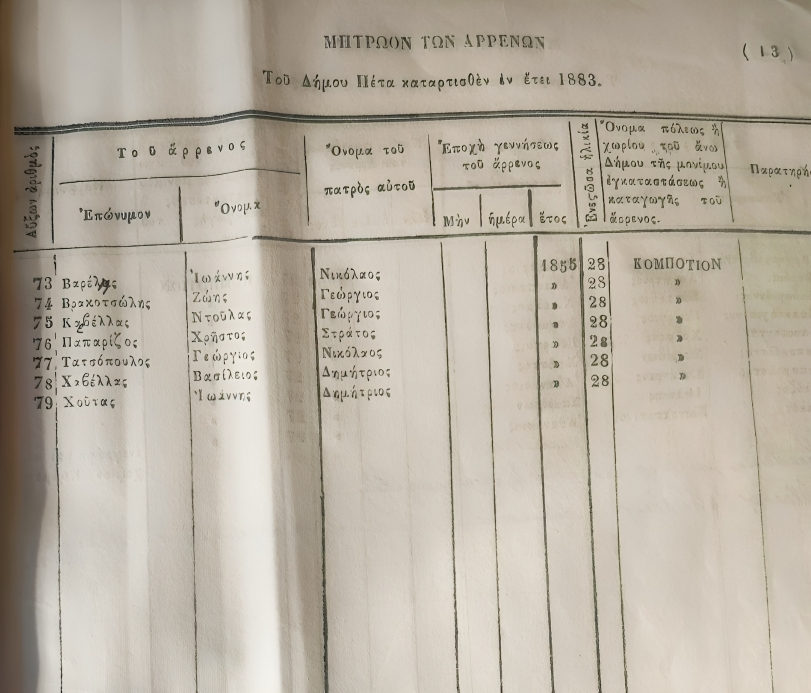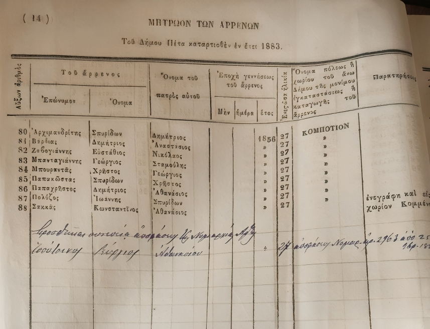 Πρόκειται για το Μητρώο Αρρένων του Κομποτίου, καραρτισθέν εν έτει 1883. Το Μητρώο φυλάσσεται στα ΓΑΚ Άρτης. (Πηγή ΓΑΚ Άρτης).