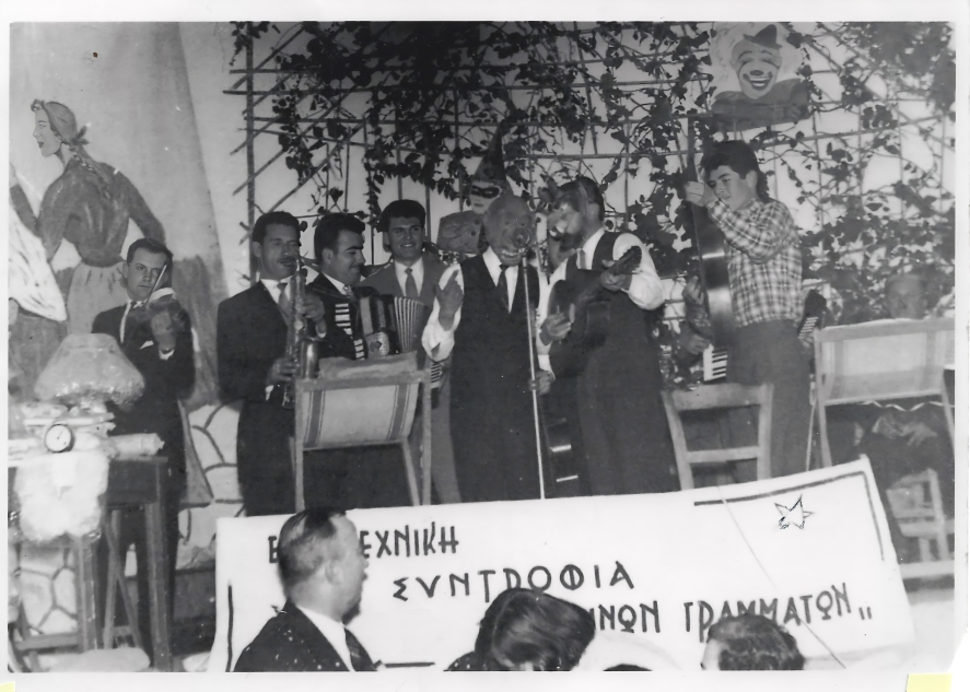 Διακρίνονται από αριστερά : Νίκος Χ. Καραβασίλης (βιολί), Κώστας Ψιλόπουλος (σαξόφωνο), Σπύρος Α. Τρομπούκης (Ακορντεόν), Χρήστος (Τάκης) Γκρεμπούνης (κιθάρα). Με τις μ΄σκες οι Σπύρος Ζαρκαλής και Βασίλειος Ντέτσικας. Δεγιά με την κιθάρα ο Ελευθέριος Κ. Ρίζος. (Φωτο από αρχείο Ι. Έξαρχου, Παρυσίαση Κ. Μπανιάς)