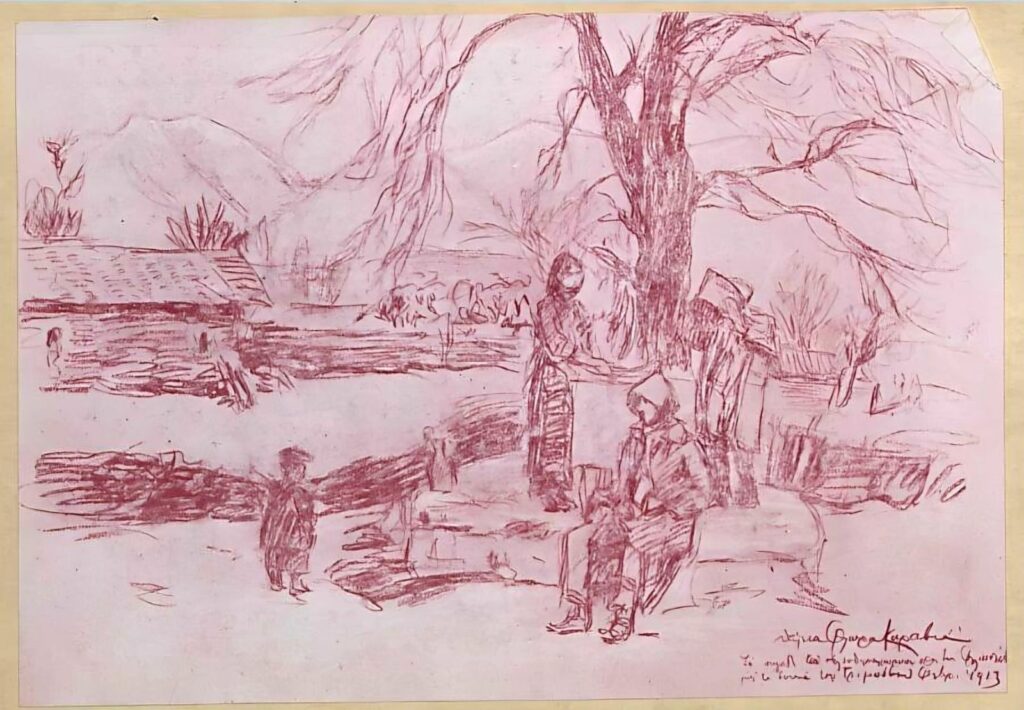 Στη φωτογραφία “‘Αποψις Γριμπόβου”, σκίτσο της Θ. Φλωρά – Καραβία. (Πηγή : ΕΝΤΥΠΩΣΕΙΣ ΑΠΟ ΤΟΝ ΠΟΛΕΜΟ ΤΟΥ 1912 – 1913, Θάλεια Φλωρά – Καραβία, Αθήναι, 1936)
