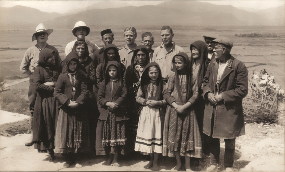 Δίπλα στα σκούρα μάλλινα και τις ποδιές των γυναικών, οι Άγγλοι της αποστολής με τα καπέλα, τα ελαφρά σακάκια και τις μπότες τους θυμίζουν έναν άλλο κόσμο· η στολή της παράδοσης απέναντι στη στολή της εργασίας. (Φωτο από αρχείο Οικογένειας Χόλτερμαν).