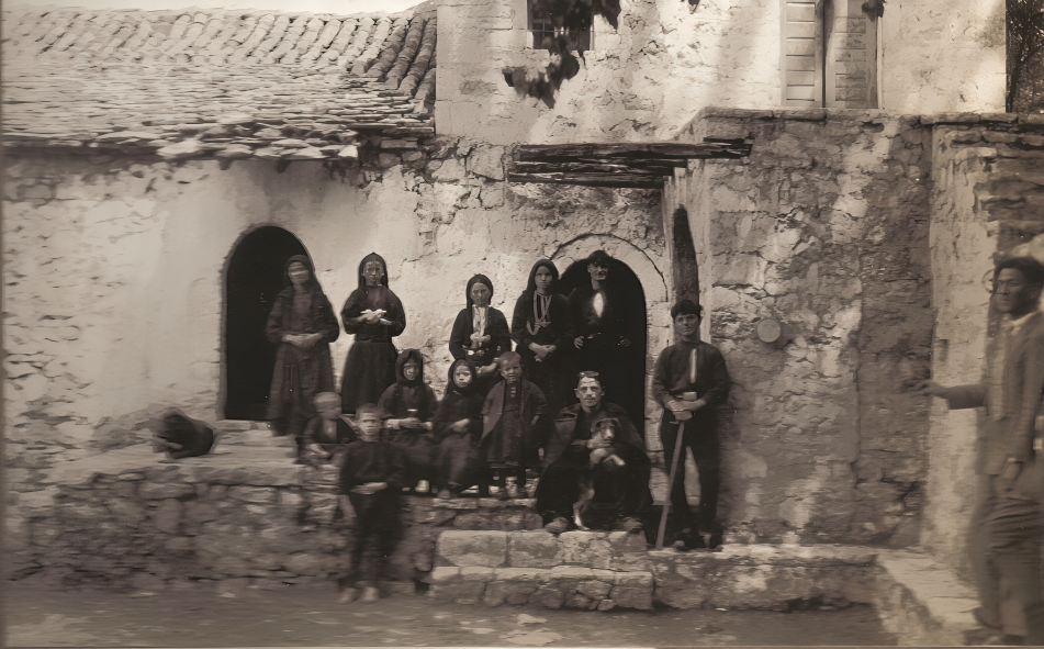 Their clothes, dark and woollen, speak of the austerity of Epirote life; the stone house, with its rough walls and narrow steps, frames a world built from endurance and faith.