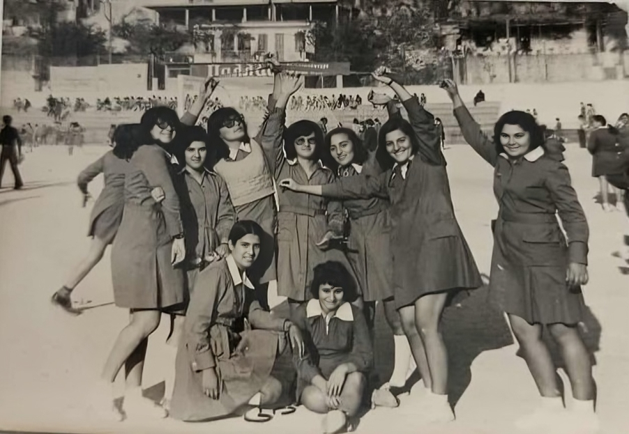 Η φωτογραφία του 1973 αποτυπώνει μια εντελώς διαφορετική —αλλά εξίσου χαρακτηριστική— εκπαιδευτική κουλτούρα. Οι μαθήτριες με την κλασική ποδιά, το λευκό γιακά και την ομοιομορφία που επέβαλλε τότε το σχολικό πλαίσιο συνθέτουν μια εικόνα βαθιάς τυποποίησης, αλλά ταυτόχρονα και μιας νεανικής ζωντάνιας που «σπάει» τον κανόνα.