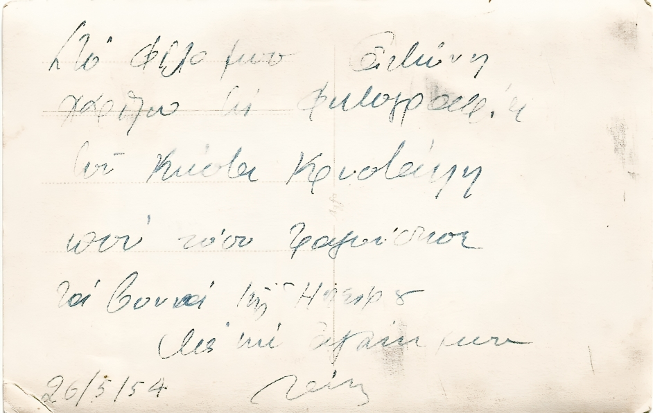 Στην πίσω όψη της κάρτας, λίγες γραμμές — σχεδόν δυσανάγνωστες σήμερα — μαρτυρούν μια προσωπική στιγμή, μια επικοινωνία που χάθηκε στον χρόνο, αλλά διασώζει την ανθρώπινη παρουσία πίσω από το όνομα.