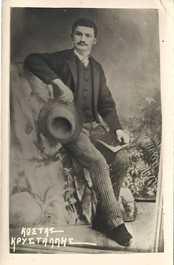 Η φωτογραφική αυτή κάρτα, από το αρχείο της Κλαίρης Βάφια – Μπανταλούκα, μας φέρνει πρόσωπο με πρόσωπο με τον Κώστα Κρυστάλλη. Νεαρός, με βλέμμα ήρεμο και σταθερό, κρατά στο χέρι του ένα βιβλίο, ενώ το καπέλο ακουμπά χαλαρά δίπλα του — σαν μια λεπτομέρεια καθημερινότητας που έγινε μνήμη.