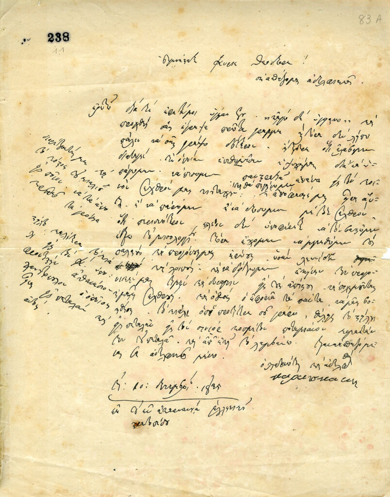Ερωτώ δια την ερίτιμον υγείαν σου και εγώ δε υγιαίνω. Προχθές σας έγραψα πρώτο γράμμα και τώρα δεν λείπω πάλιν να σας γράψω δεύτερον. Ήξευρε ότι ελάβομεν διαταγήν την οποία επιθύμησεν η ψυχή μας δια να υπάγομεν να πιάσομεν πανστρατιά ενάντια εις τον κοινόν εχθρόν μας Κιουταχή. Απόφασή μας είναι ή να πάρομεν ή να δώσομεν με τον εχθρόν διότι περισσότερον πλέον δεν υποφέρεται να τον βαστώμεν έξω του Μεσολογγίου. Τώρα έχομεν να μιμηθώμεν τους παλαιούς προγόνους μας ηρώους ωσάν Λεωνίδαν και λοιπούς και να δείξομεν εκείνην την προγονική μας τιμίν και δύναμιν εις τους απίστους και πολεμούντας μας εχθρούς και ο Θεός ο εφορών τα πάντα να μας βοηθήσει. Το κιάλι όπου πρωτύτερα σου γράφω θέλεις το στείλη εις τον σινιόρ Κοσμέτον Ποτεμιάνον […] του Πεταλά και απ’ εκεί το λαμβάνω.
