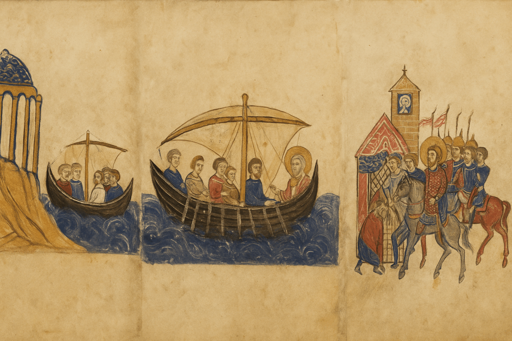 Η θάλασσα, οι πορείες και οι τελετουργίες της βυζαντινής αυλής ζωντανεύουν μέσα από τις μινιατούρες — εικόνες ενός κόσμου που θα αναζητήσει νέα πατρίδα μετά το 1204.