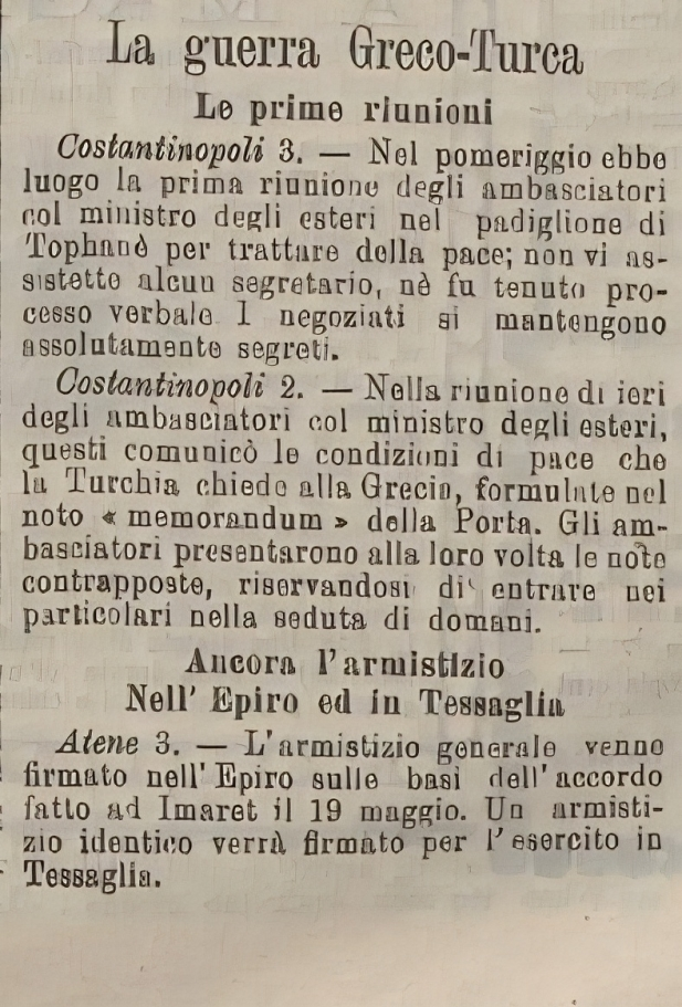 Το απόσπασμα προέρχεται από την ιταλική εφημερίδα Il Cittadino Italiano, που εκδιδόταν στην πόλη Udine. Το συγκεκριμένο φύλλο, με ημερομηνία 19 Μαΐου 1897, περιλαμβάνει τηλεγραφήματα με τίτλο «La guerra Greco-Turca – Le prime riunioni» και υπότιτλο «L’armistizio – Nell’Epiro e in Tessaglia».