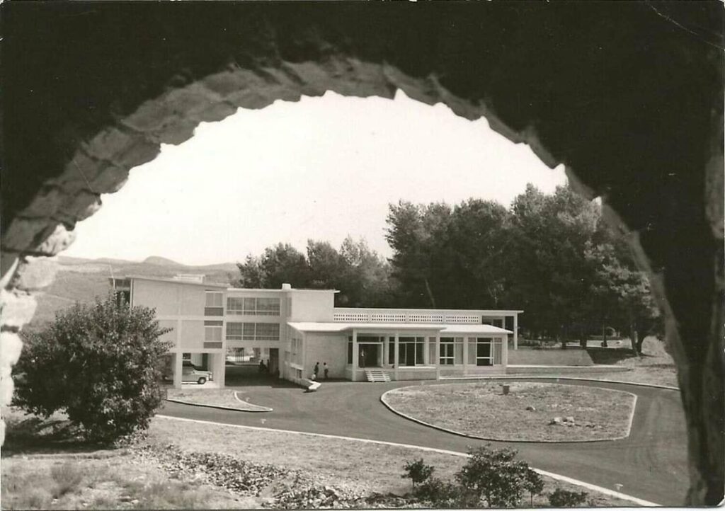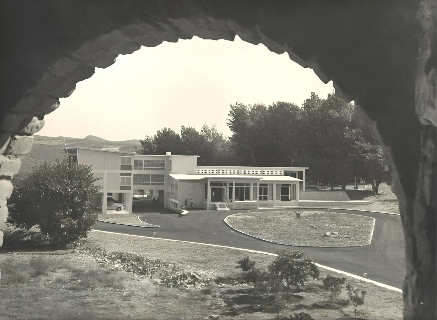 Η πρώτη φωτογραφία αποτελεί την αυθεντική λήψη του Ξενία Άρτας, εντός του Κάστρου, όπως διασώζεται στη Βιβλιοθήκη της Βουλής των Ελλήνων (Συλλογές, Συλλογή Τσαγκαρή). Δεν πρόκειται απλώς για μια καταγραφή ενός κτιρίου, αλλά για μια συνειδητή καλλιτεχνική σύνθεση: το κτίσμα πλαισιώνεται από ένα φυσικό άνοιγμα βράχου, δημιουργώντας ένα έντονο, σχεδόν σκηνοθετημένο κάδρο που καθοδηγεί το βλέμμα και προσδίδει βάθος και ατμόσφαιρα.