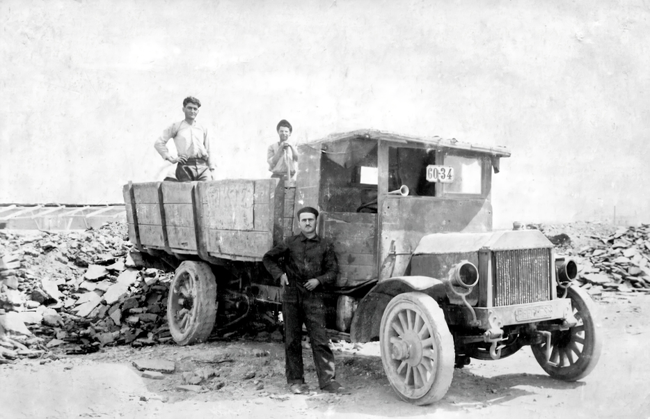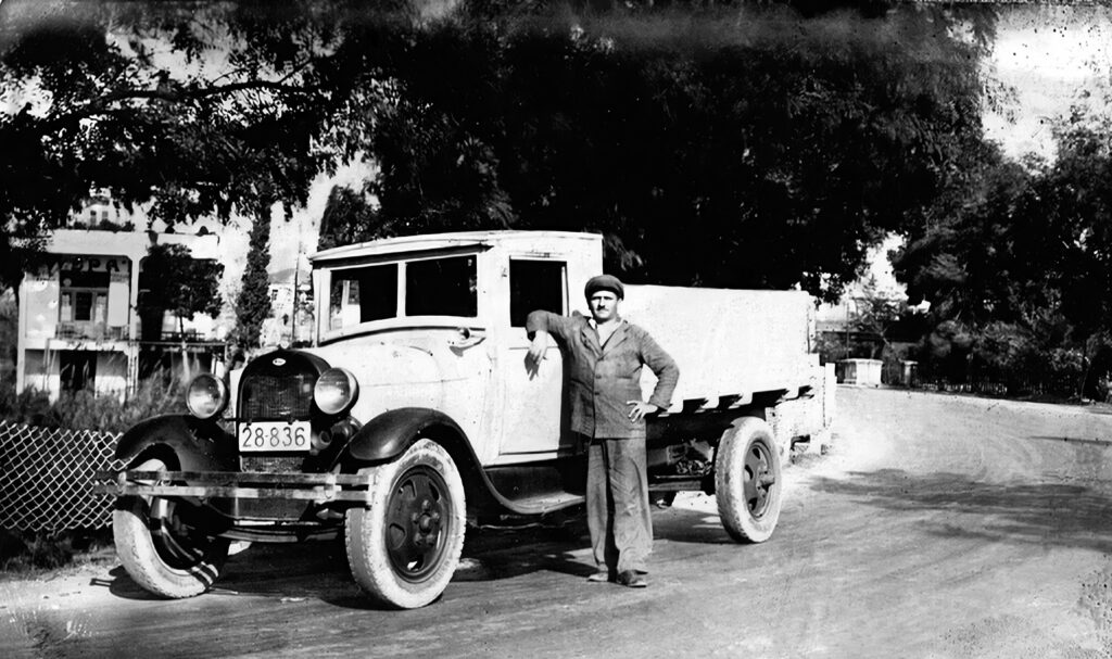 Ο Διομήδης Ναούμ με το φορτηγό του εργοστασίου ΦΙΞ, Πατήσια, δεκαετία 1930. Με αυτό το όχημα θα βρεθεί λίγα χρόνια αργότερα στο μέτωπο. Αρχείο οικογένειας Γ. Ψαρογιάννη.