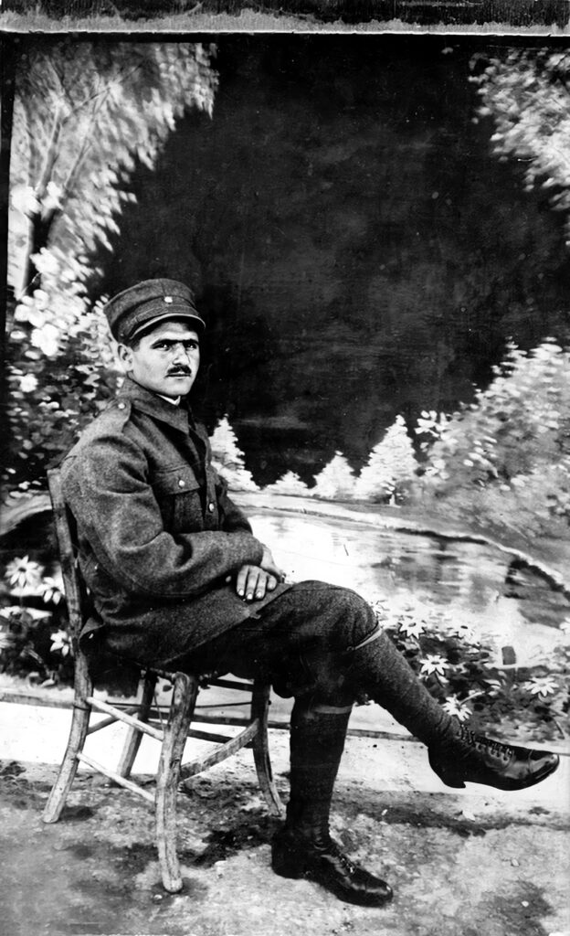 Στην άλλη φωτογραφία που είναι βγαλμένη σε στούντιο και κάθεται ο παππούς μου σε μια καρέκλα με φόντο ένα ποταμάκι, είναι κι αυτή σε φωτογραφείο στους Αγίους Σαράντα. Εκείνη την εποχή οι στρατιώτες όταν κατελάμβαναν μια πόλη συνήθιζαν να πηγαίνουν σε φωτογραφεία κατά ομάδες, να φορούν την στολή της παρέλασης και να βγαίνουν φωτογραφία.. Υπάρχουν και πολλές παρόμοιες φωτογραφίες με στρατιώτες που πολέμησαν στην Μικρά Ασία βγαλμένες σε στούντιο,  από φωτογραφεία της Σμύρνης. Έτσι είθισται εκείνη την εποχή, οι στρατιώτες να ξυρίζονται να πλένονται και να πηγαίνουν να βγάλουν φωτογραφία με την επίσημη στολή της παρέλασης για να την στείλουν στα αγαπημένα τους πρόσωπα. Ίσως αναρωτηθείτε είχαν και στολές παρέλασης μαζί και μάλιστα τόσες πολλές. Όχι, απλά πήγαινε ο στρατός και έδινε πέντε  έξι στολές στο φωτογραφείο και μετά φορούσανε όλοι τις ίδιες στολές απ’ αυτές που είχε πάει ο στρατός. «Φορούσαμε όλοι την ίδια στολή — η στολή της φωτογραφίας ήταν δανεική».
