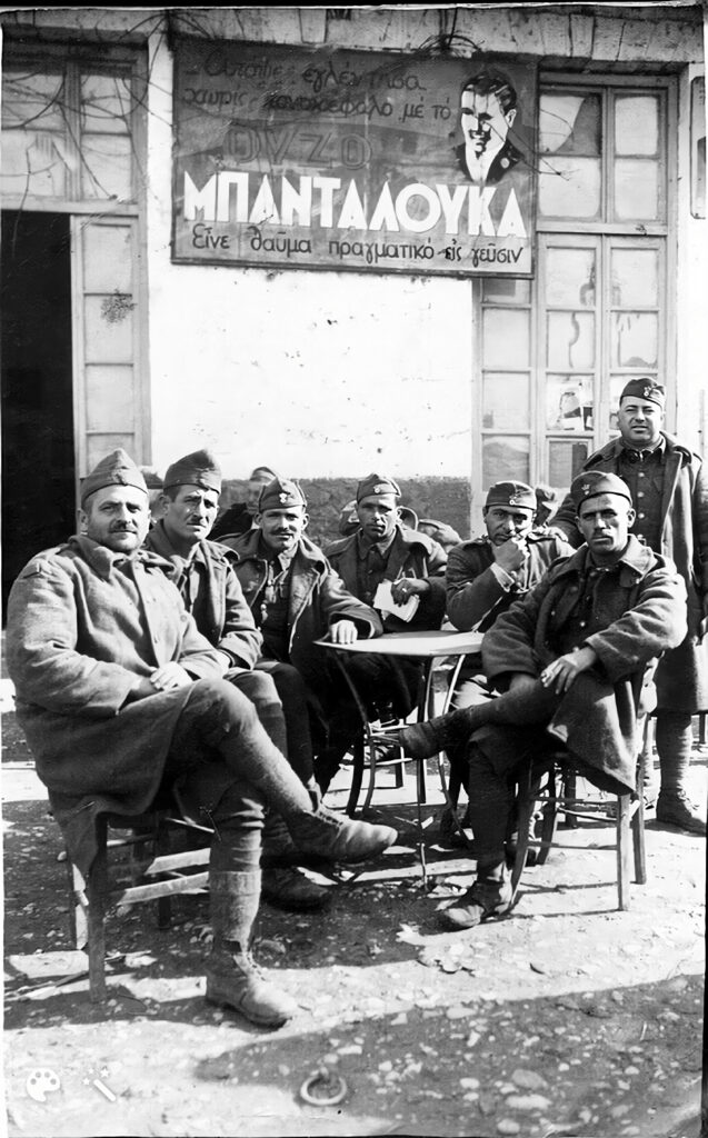 Κι εδώ, μέσα σε μια σκονισμένη φωτογραφία του ’40, δεν βλέπουμε μόνο στρατιώτες κουρασμένους από τον δρόμο της ιστορίας∙ βλέπουμε και την πατρίδα τους να ταξιδεύει μαζί τους, ακόμη και σε μια μικρή ξύλινη λέξη πάνω από ένα πρόχειρο καφενείο.