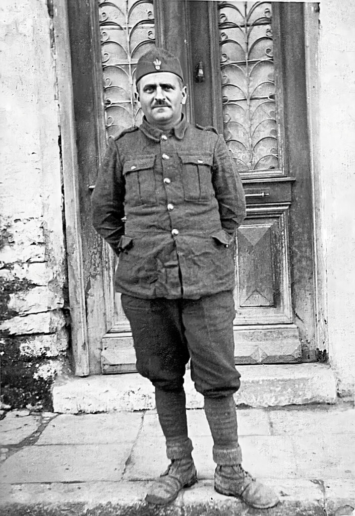 Αθήνα, 1941 — η πρώτη φωτογραφία του Διομήδη μετά την επιστροφή από το μέτωπο. Λίγο πριν τον αγκαλιάσουν τα παιδιά του, αφού πρώτα… ξεψείρισε τα ρούχα του. Αρχείο οικογένειας Γ. Ψαρογιάννη