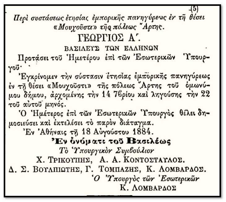Στη φωτογραφία “Το Β.Δ.335/22-8-1884, «Περί συστάσεως εμπορικής πανηγύρεως εν τη θέσει «Μουχούστι» της πόλεως Άρτης”.