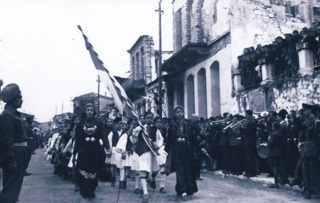 Μια ιστορική φωτογραφία της παρέλασης της 25ης Μαρτίου μεταξύ 1945 – 50. Η παρέλαση την εποχή εκείνη ξεκινούσε από το Μονοπλιό και κατευθύνονταν προς την οδό Ζάρρα, είχε δηλαδή αντίθετη φορά από τις παρελάσεις από την δεκαετία του ’50 και μετά. Η συγκεκριμένη λήψη είναι μπροστά στην πλατεία Κιλκίς όπου βρίσκονταν οι επίσημοι. Δεξιά διακρίνονται οι μουσικοί, κάτω από τον περίβολο της πλατείας Σκουφά, απ’ όπου παρακολουθεί την παρέλαση πλήθος κόσμου. Μπορεί επίσης κάποιος να δει το βομβαρδισμένο χάνι του Γεωργόπουλου που είχε καταστραφεί στο βομβαρδισμό του 1941. (Η φωτογραφία είναι από το αρχείο του Τ. Ζαρκαλή)