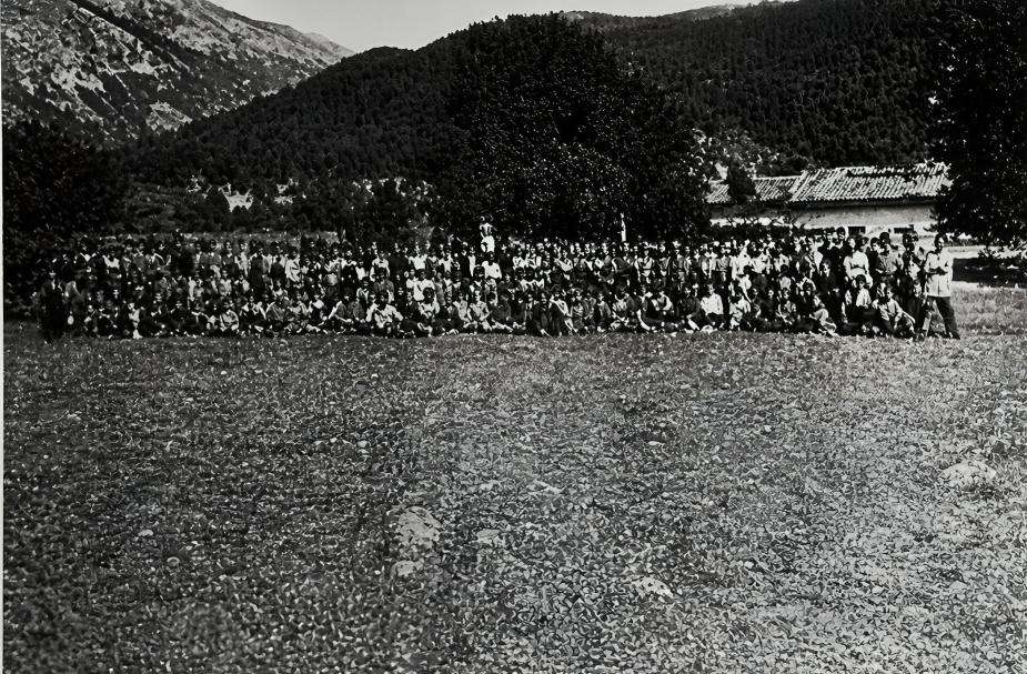 1943 – Μαθητές της Σχολής Εφέδρων Αξιωματικών των ΕΟΕΑ παρακολουθούν υπαίθρια θεωρητικά μαθήματα, στην περιοχή Βρωμοπήγαδο Γαυρόγου σταΡαδοβίζια, κατά την περίοδο της Κατοχής.