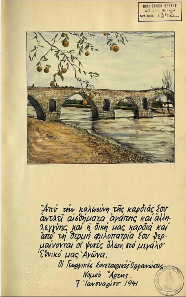 Τον Ιανουάριο του 1941, ενώ ο πόλεμος βρισκόταν σε εξέλιξη, γεωργικοί συνεταιρισμοί από 53 χωριά του Νομού Άρτας έστειλαν ευχές στον Ιωάννη Μεταξά για την ονομαστική του εορτή. Κάθε χωριό εκπροσωπείται από ένα ξεχωριστό ευχετήριο έγγραφο, με υπογραφές και σφραγίδες των συνεταιρισμών.