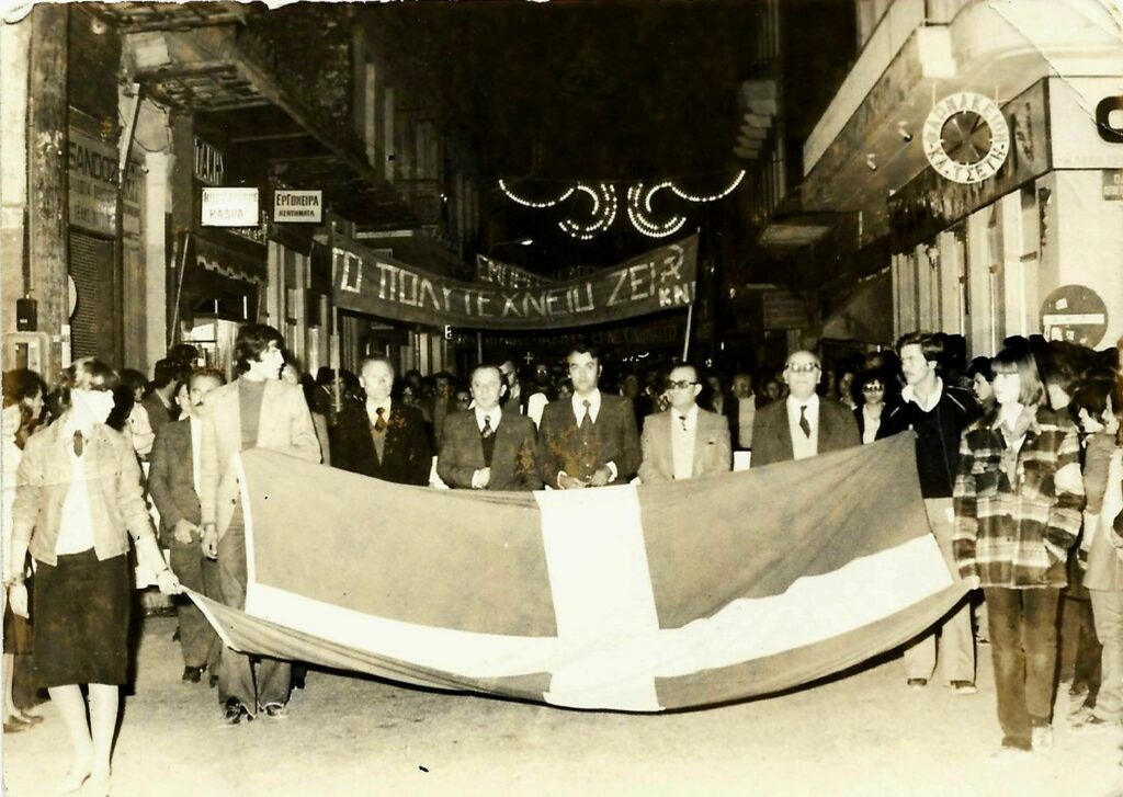 Μια φωτογραφία από την πορεία για το Πολυτεχνείο στην Άρτα, στις 17 Νοεμβρίου 1978 με τον τίτλο ” Ενθύμιο από τις 17 Νοέμβρη 1978, Ε.ΚΟ.Ν – Ρήγας Φεραίος”. Εδώ η πορεία βρίσκεται στο ύψος της Κεντρικής Πλατείας, μπροστά από το φαρμακείο Σόνιας Τσέτη – Παπανικολάου. Διακρίνονται οι Γιώργος Μπίκας, (γιατρός), Αλέκος Λιαροκάπης (δικηγόρος – βουλευτής), στη μέση ο Δημήτρης Τσοβόλας (δικηγόρος – βουλευτής) και στην άκρη αριστερά ο νεαρός που κρατά τη σημαία είναι ο Νίκος Νικολάου. (Φωτο από αρχείο Αικατερίνης (Κατίνας) Νικολάου – Κούτσικου)