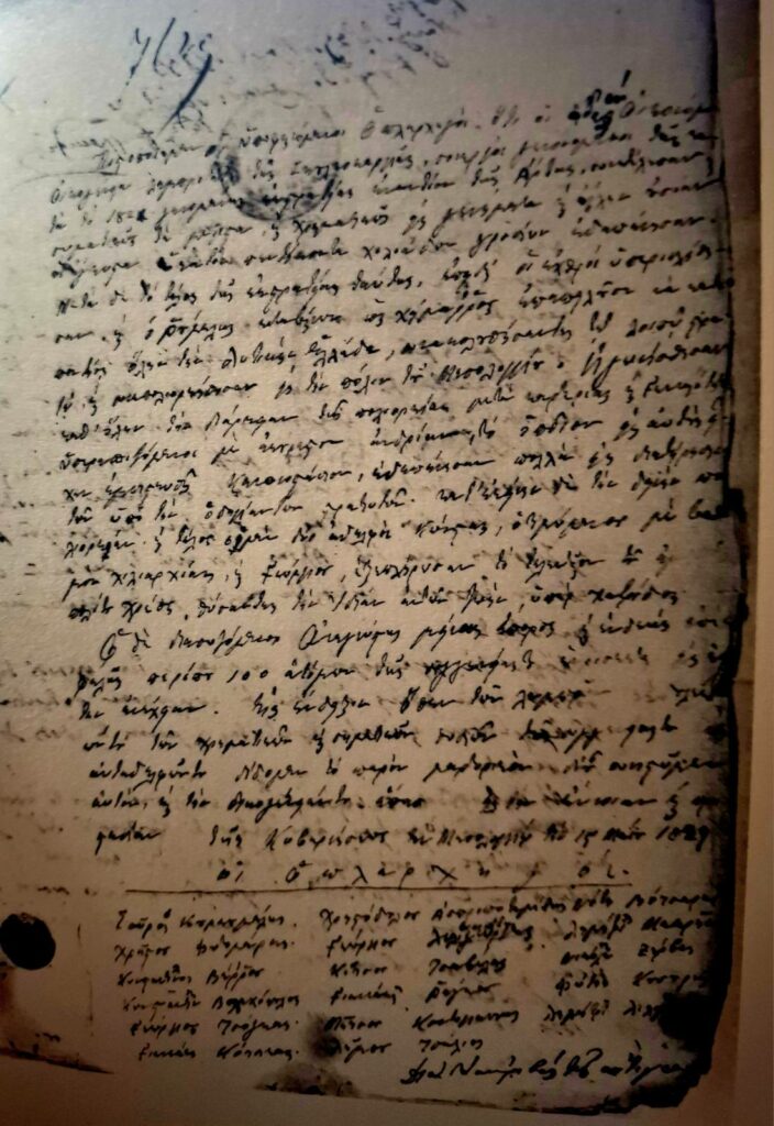 Στη φωτογραφία ” Το Πιστοποιητικό οπλαρχηγών του Αγώνα (Μεσολόγγι, 15 Μαΐου 1829), που αναφέρεται στη δράση και την προσφορά της οικογένειας Οικονόμου από τη Σκουληκαριά”. (Πηγή : Ο ΣΤΡΑΤΗΓΟΣ ΚΩΣΤΑΣ ΟΙΚΟΝΟΜΟΥ, Μ. Οικονόμου, Αγρίνιο, 2022)