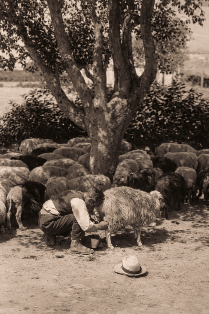 Η φωτογραφία αποτυπώνει τη διαδικασία του αρμέγματος, μια βασική πρακτική της αγροκτηνοτροφικής ζωής της ελληνικής υπαίθρου στις αρχές του 20ού αιώνα (1930).