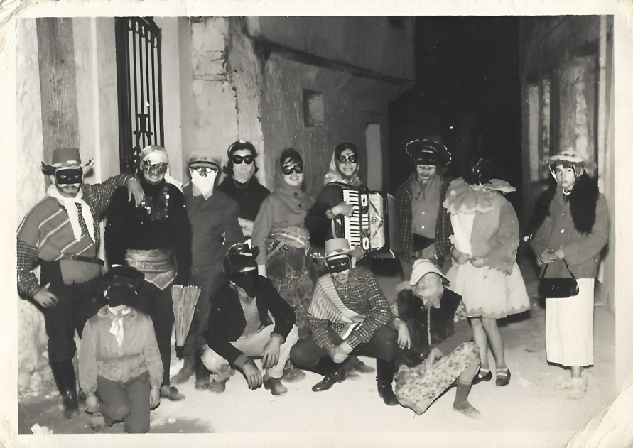 Μασκαράδες: Σοφία Καρατζά, Σόλων Σερβετάς, Πατρούλα Σκανδάλη, Γιάννης Σερβετάς, Γιώργος Σιμιτζής, ……Τσιγκρέλη, ……Σιμιτζή, Καίτη Βαλάρη κ.α. (Φωτο από αρχείο Σοφίας Καρατζά)