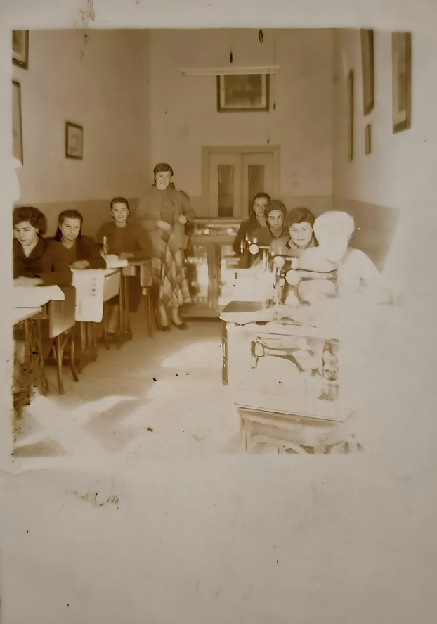 Μια υπέροχη, παλιά φωτογραφία από μια σχολική αίθουσα ραπτικής στην Άρτα, ξεθωριασμένη από το χρόνο — τα κορίτσια καθισμένα στα θρανία, συγκεντρωμένα, και μπροστά η κλασική ραπτομηχανή Singer, σύμβολο μιας άλλης εποχής. Μια ζεστή ματιά στο παρελθόν.