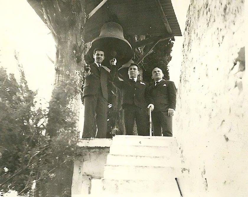 8 Απριλίου 1966. Βασίλης Καρατσώλης, Κ. Κωτσάκης και Αντώνης Στρατής χτυπάν την καμπάνα της Αγίας Θεοδώρας. (Η φωτογραφία είναι από το αρχείο του Π. Μάνθα)