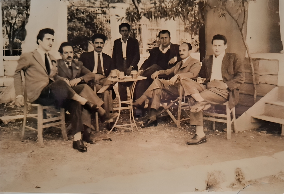 1950ς – Μια παρέα στο σημερινό “Εν Άρτι”, τότε κέντρο του Βίκτωρα Σακκά, στην πλατεία Σκουφά. Από δεξιά : Ευάγγελος Σκουτέρης, Ιωάννης Ρούκης, Ν΄. Οικονόμου, Λάκης Διαμάντης, Μιχ. Παπάζογλου, Γρηγόρης Αρβανίτης. (Φωτο & Παρουσίαση Κ.Μπανιάς)