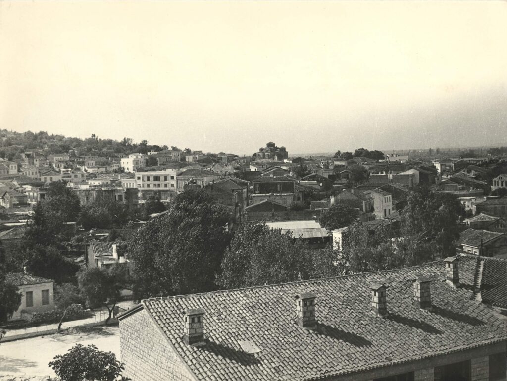 Η λήψη φαίνεται να έχει γίνει από τα τείχη του Κάστρου. Σε πρώτο πλάνο διακρίνεται η στέγη του 2ου Δημοτικού Σχολείου και η αυλή του, ενώ μπροστά περνά ο δρόμος όπως ήταν τότε, πριν ακόμη ρυμοτομηθεί.