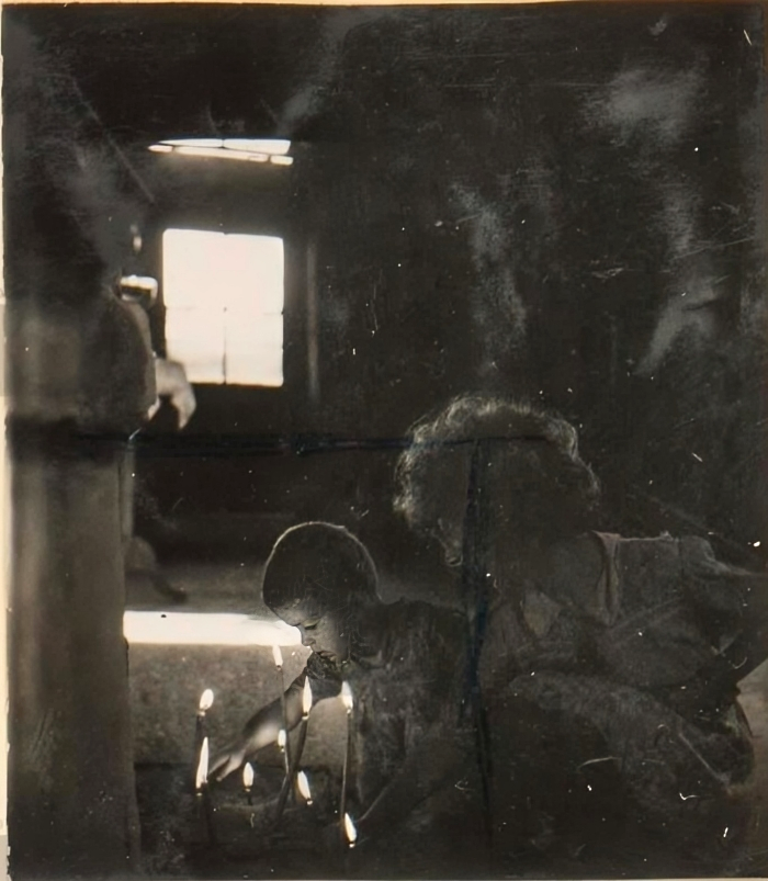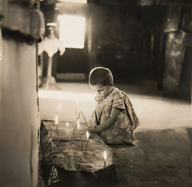 Το παιδί στέκεται δίπλα στα αναμμένα κεριά κρατώντας ακόμη το λεπτό κερί στο χέρι, σαν να ολοκληρώνει τη σιωπηλή του προσευχή.
