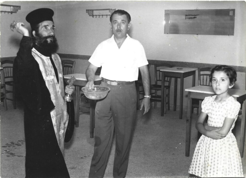 Στη δεύτερη φωτογραφία, πάλι απο τα εγκαίνια, ο παπα Νίκος του Αγίου Γεωργίου ραντίζει το μαγαζί κι εύχεται καλορίζικο και καλές δουλειές! (Φωτογραφίες :Σοφία Καρατζά)