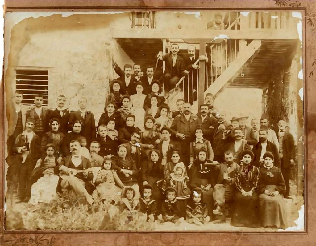 Ιδιαίτερο ενδιαφέρον παρουσιάζει η παρουσία μουσικού οργάνου, καθώς ο καθιστός άνδρας στο προσκήνιο κρατά μαντολίνο, στοιχείο που παραπέμπει σε οικογενειακή ή κοινωνική συγκέντρωση με μουσική. Στο τέλος της σκάλας, αριστερά, διακρίνεται ο Ν. Παπακώστας από τους Μελισσουργούς. Η φωτογραφία προέρχεται από το αρχείο του συλλέκτη Ν. Φασουλή, τον οποίο ευχαριστούμε θερμά που τη μοιράστηκε μαζί μας.