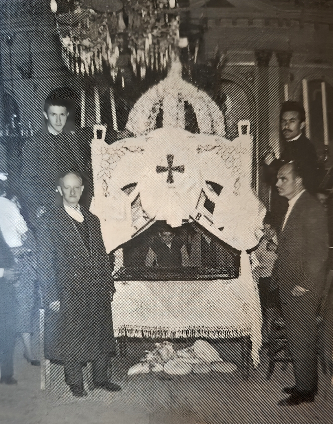 Μεγάλη Παρασκευή του 1958. Ο Επιτάφιος είναι έτοιμος για την αναμνηστική φωτογραφία. Μπροστά οι Θανάσης Πεταλάς (νεοκόρος) και Γιώργος Ευαγγελίου. Πίσω, πάνω σε καρέκλες, οι Γιώργος Χαλκιάς και Μιχάλης Χριστοδούλου (Καζάκος). [Πηγή : ΑΝΑΜΝΗΣΕΙΣ ΑΠΟ ΤΗ ΜΕΤΑΠΟΛΕΜΙΚΗ ΑΡΤΑ, Γ. Χαλκιάς, Αθήνα, 2023]