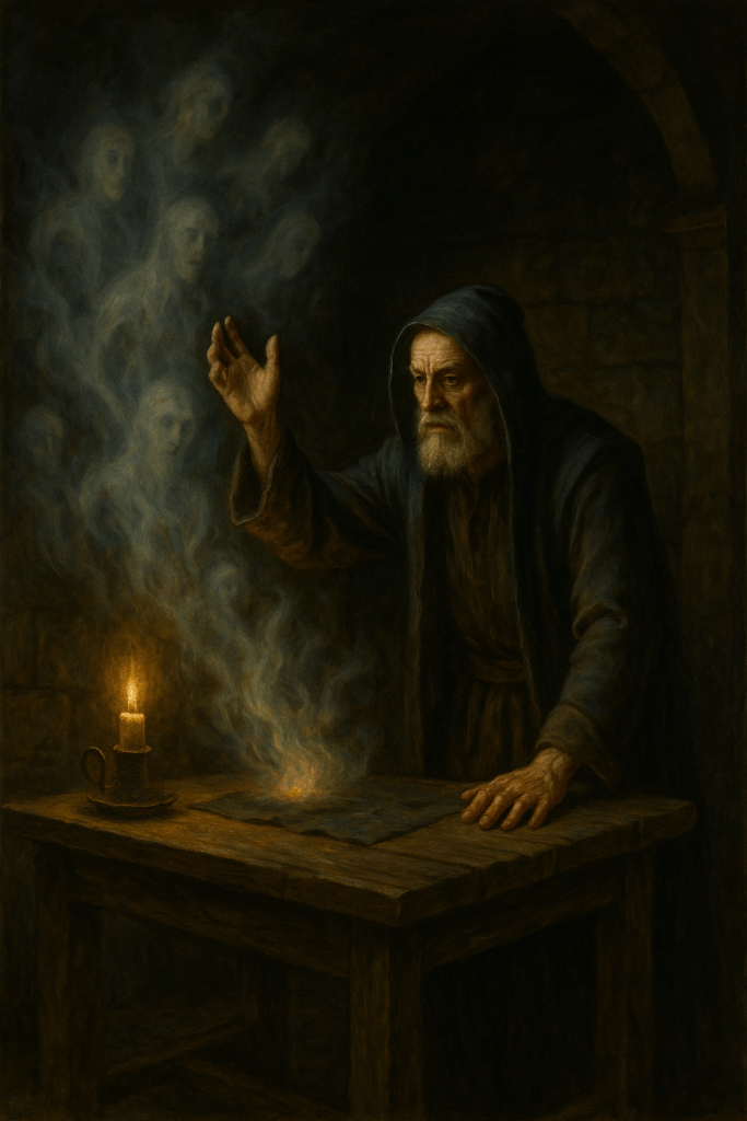 Ο Τριαντάφυλλος σκέπασε το δωμάτιο με μυρωδιά λιβανιού και ψιθύρισε τα λόγια που μόνο εκείνος μπορούσε να πει. Το φως χαμήλωσε· ο αέρας κάπως πάγωσε· κι άρχισαν να μαζεύονται τα πνεύματα, άυλα και βουβά, σαν ίσκιοι που δεν τους προσέχει κανείς μέχρι να είναι πολύ αργά. Ήρθαν όλα — όλα εκτός από τον Κουτσό, τον αρχηγό τους, τον πιο φοβερό.