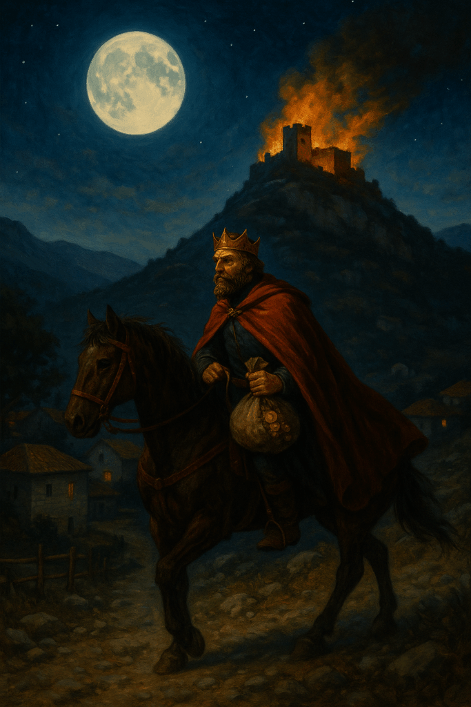 Σηκώθηκε τότε και χάθηκε μες στη νύχτα, παίρνοντας μαζί του όσο χρυσάφι μπορούσε να κουβαλήσει.