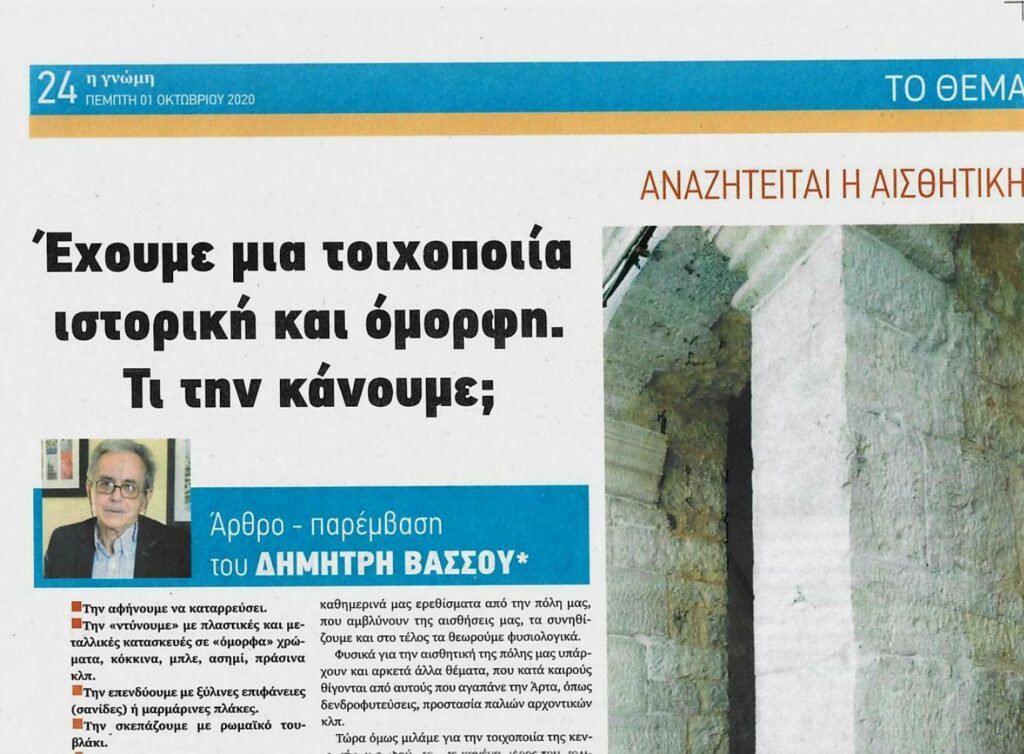 Δημήτρης Βάσσος, «Έχουμε μια τοιχοποιία ιστορική και όμορφη. Τι την κάνουμε;», εφημ. Η Γνώμη, Πέμπτη 1 Οκτωβρίου 2020, σ. 24.