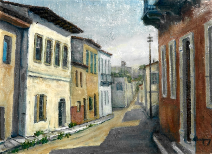 Η οδός Βασιλέως Πύρρου το 1952. Πίνακας σε λάδι του Τάκη Βαφιά, από την συλλογή της κ. Κλαίρης Βαφιά – Μπανταλούκα.