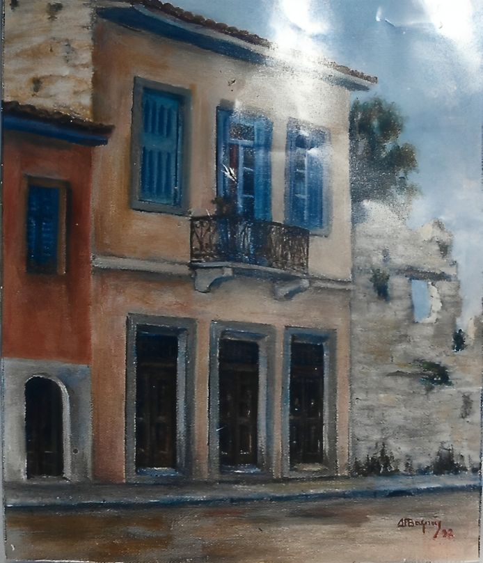 Πίνακας του Τάκη Βαφιά που απεικονίζει κάποια σπίτια στην οδό Πριοβόλου, που δεν υπάρχουν πια. Το ροζ σπίτι ήταν η οικία του Γεωργίου Τσούτσινου, τα δε χαλάσματα στην δεξιά πλευρά του πίνακα είναι σήμερα η Λαϊκή αγορά της Άρτας. (Φωτο από αρχείο Κλαίρης Βαφιά – Μπανταλούκα)