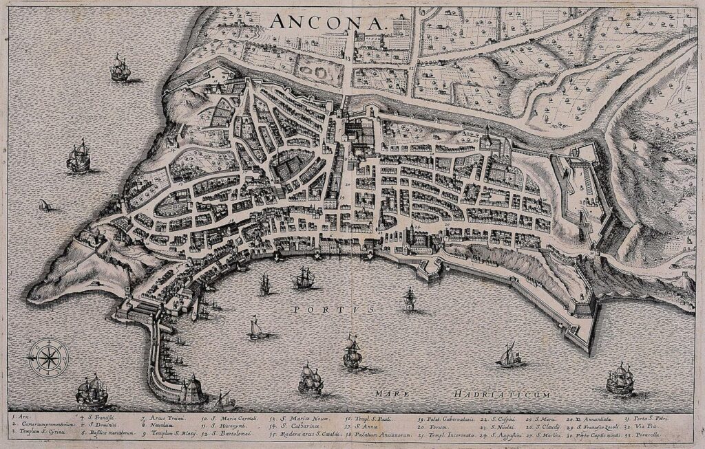 Άποψη της Ανκόνας και του λιμανιού. Χαλκογραφία, 17ος αιώνας. Προέλευση: Ιταλικό Υπουργείο Πολιτιστικής Κληρονομιάς (ICCD).