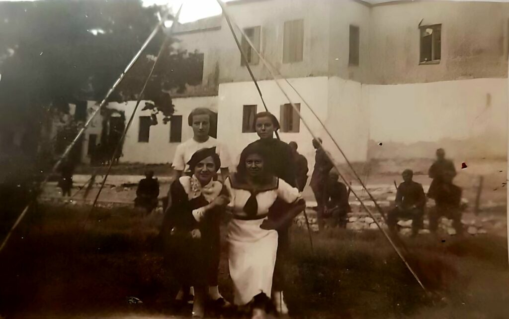 Στο κέντρο της αυλής διακρίνεται ο πλάτανος, ενώ γύρω του φαίνονται εύζωνοι του 40ού Τάγματος Ευζώνων και μια παρέα νεαρών κοριτσιών”. (Η φωτογραφία προέρχεται από το αρχείο του κ. Ζίκου Παπαζότου και αναρτήθηκε στην ομάδα Παλιές Φωτογραφίες Άρτας.)