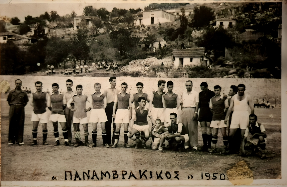 Μια δυναμική ομάδα στη ΒΔ. Ελλάδα : Χούμης Κων. (Διεθνής : ΕΘΝΙΚΟΣ – Ο.Σ.Φ.Π. – Μέγας Γκολτζής 1933 – 1940. 1ος σκόρερ της πρωταθλήτριας Ρουμανίας ΒΕΝΟΥΣ 1936 – 1940), Δήμου Β., Έξαρχος Ν., Κεχαγιάς Κ., άγνωστος, Τζαχρήστας Κ., Σίτας Δ., Μπόλας Κ., Αρτέμης Ν., Ζέρβας Α., Ζάχος Απ., Σαλούρος Χαράλαμπος (Φυσικός, Πρόεδρος), Σδούκος, Μπόλας Γ., Μαρκαμπέλας Σόλων, Σακκάς Βίκτωρ, Ζάχος Ν., Τσαντούκλας Μ. και ο μικρός Γιώτης Δημήτριος . (Φωτο από αρχείο Δ. Γιώτη – Παρουσίαση Κ. Μπανιάς)
