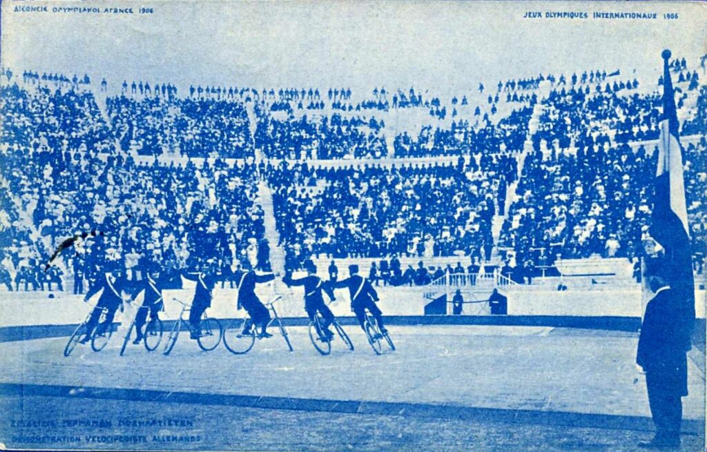 Στη φωτογραφία Επίδειξη δεξιοτεχνίας Γερμανών ποδηλατών στους Μεσολυμπιακούς Αγώνες της Αθήνας, 1906, στο Παναθηναϊκό Στάδιο.