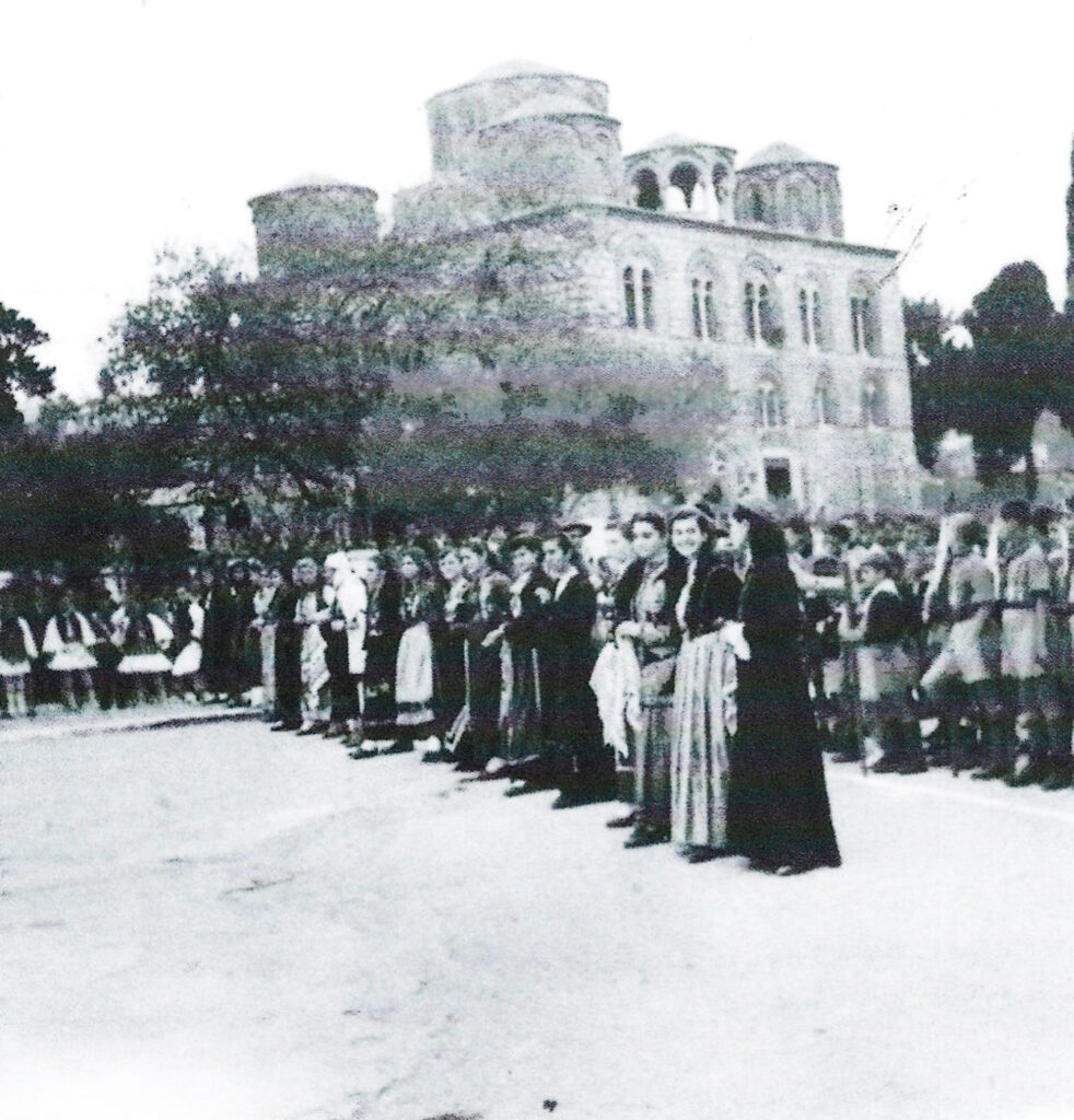 28 Οκτωβρίου 1953 – “Στην πλατεία Σκουφά συναθροίζονταν όλα τα τμήματα νέων που θα λάβαιναν μέρος στην παρέλαση. Στην φωτογραφία με φόντο το βυζαντινό ναό της Παρηγορήτισσας διακρίνονται μαθητές και μαθήτριες με εθνικές ενδυμασίες και πρόσκοποι. Σε πρώτο πλάνο διακρίνονται οι μαθήτριες της πρώτης τριάδας του γυμνασίου Θηλέων Άρτης Ευαγγελία Χρηστάκη, Σπυριδούλα Αλίβερτη και Ιωάννα Λεφάκη”. (Φωτο από το αρχείο Σ. Αλίβερτη – Γιαννοπούλου όπως δημοσιεύτηκε στο βιβλίο του Κ. Τσιλιγιάννη Η ΠΑΡΗΓΟΡΗΤΙΣΣΑ ΤΗΣ ΑΡΤΑΣ, Άρτα, 2007)