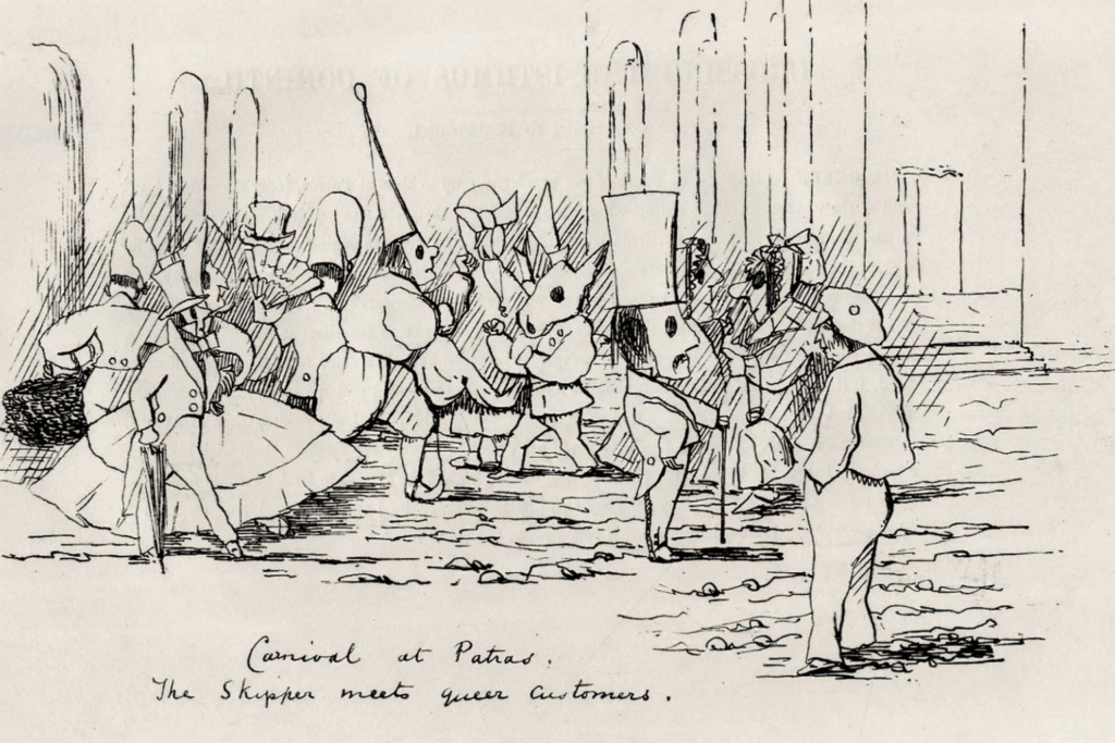Το σκίτσο στη φωτογραφία προέρχεται από το σπάνιο ταξιδιωτικό λεύκωμα Cruise of the Caroline (Δουβλίνο, 1861). Το βιβλίο περιγράφει την περιήγηση δύο Βρετανών αξιωματικών στην Ελλάδα και περιλαμβάνει 35 ολοσέλιδες εικόνες με σύντομα επεξηγηματικά κείμενα. Ανάμεσά τους βρίσκεται και η σκηνή από το Καρναβάλι της Πάτρας.